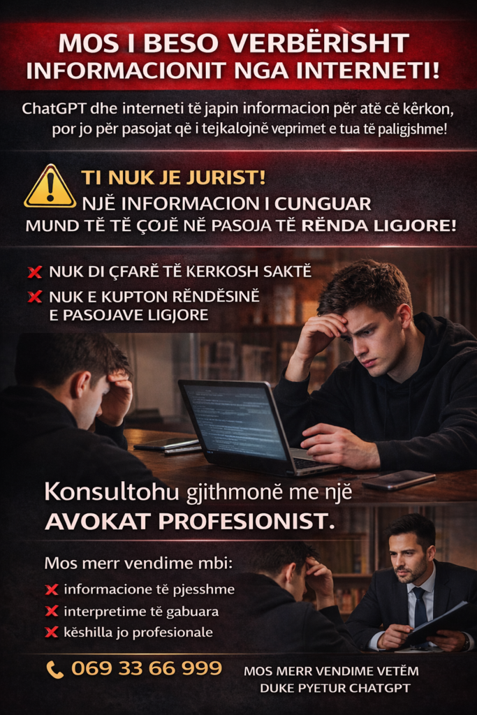 MOS I BESO VERBËRISHT INFORMACIONIT NGA INTERNETI! Shumë të rinj sot kërkojnë informacion në internet apo platforma si ChatGPT për çështje të ndjeshme. Por kujdes: ChatGPT dhe interneti në përgjithësi: Jep informacion për atë që kërkon JO për pasojat reale që mund të përballesh Nuk zëvendëson një profesionist ligjor Në çështje serioze si: Vjedhje Konflikte […]